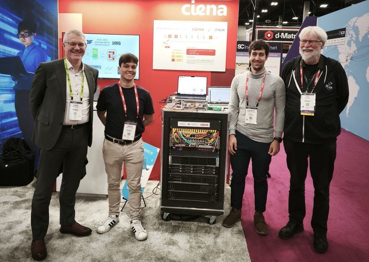 We showcased the results of two distinct research efforts. The first project, led by Anestis, focused on LLM-Based Optimization Algorithm Selection for High-Performance Networks Orchestration. The second, led by Alexandros, demonstrated Policy-aware Distributed Vertical Federated Learning infrastructure. Both works used the FABRIC testbed and live demonstrations took place at the CIENA booth. The demonstrations used CIENA’s mobile FABRIC node (pictured above).